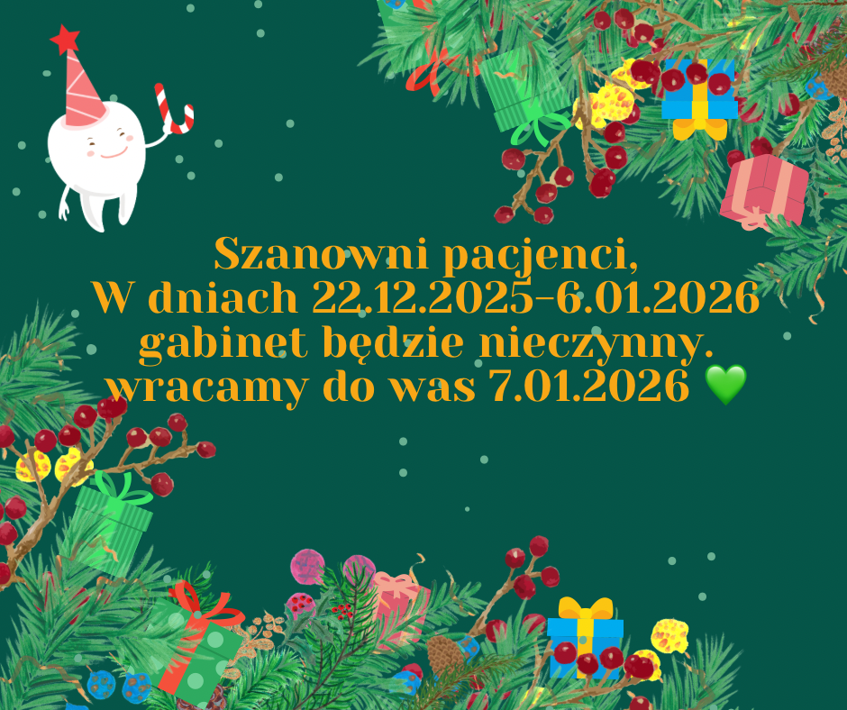 W dniach 22.12.2025-6.01.2026 gabinet będzie nieczynny.